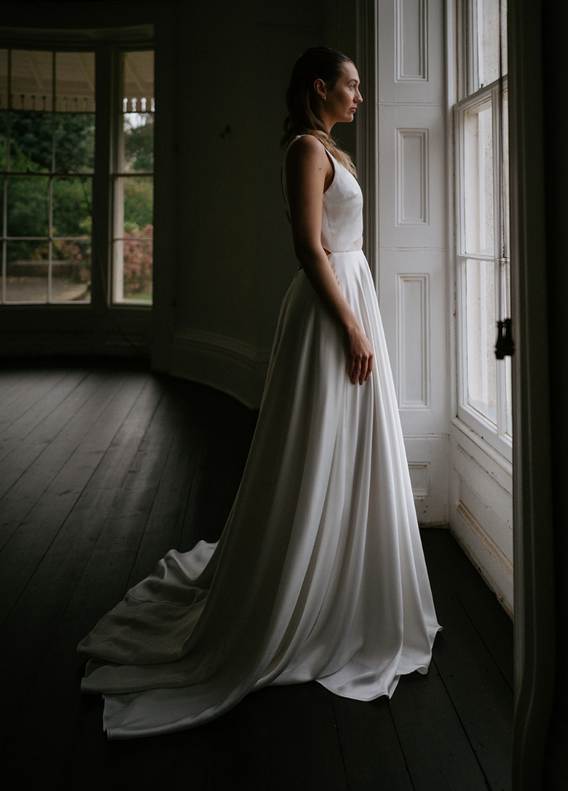 The V-neckline is a deep yet graceful elegant, paired with a sleeveless design that highlights the shoulders. A striking feature of the dress is the midriff, where an organza cut-out adds a contemporary twist (this can be filled in). The sheer organza, carefully placed to form a delicate window on the waist, contrasts beautifully with the smooth satin, creating a beautiful focal point, offering just the right amount of skin exposure without being overly daring.